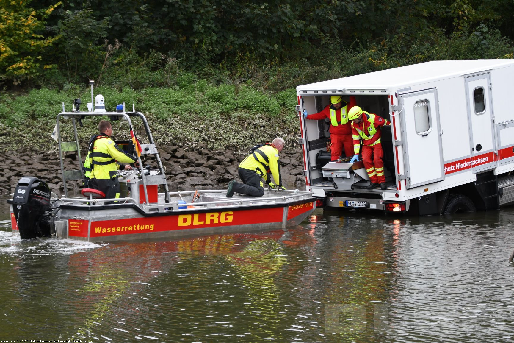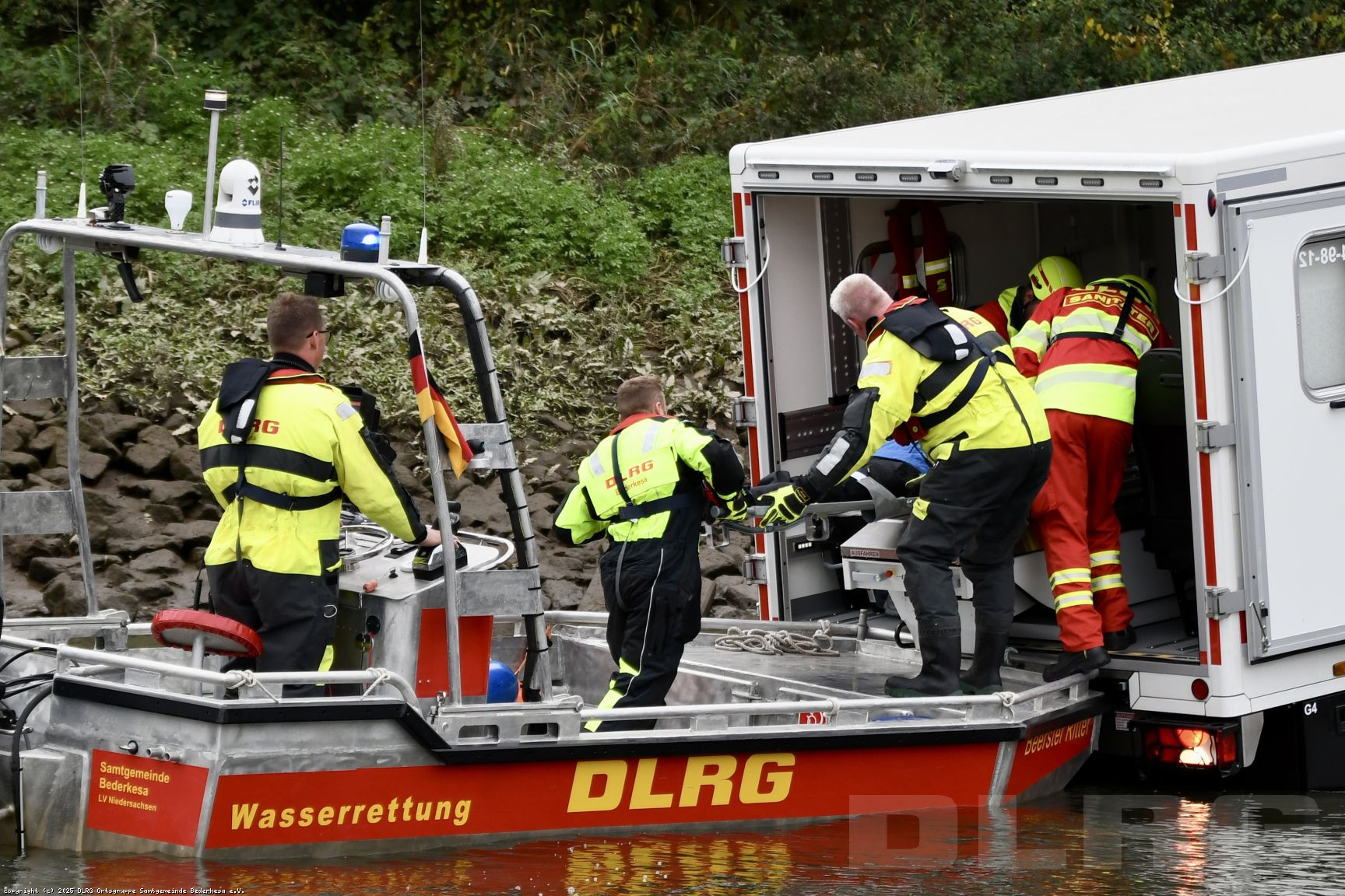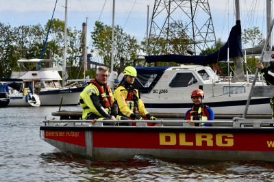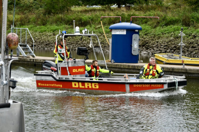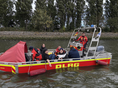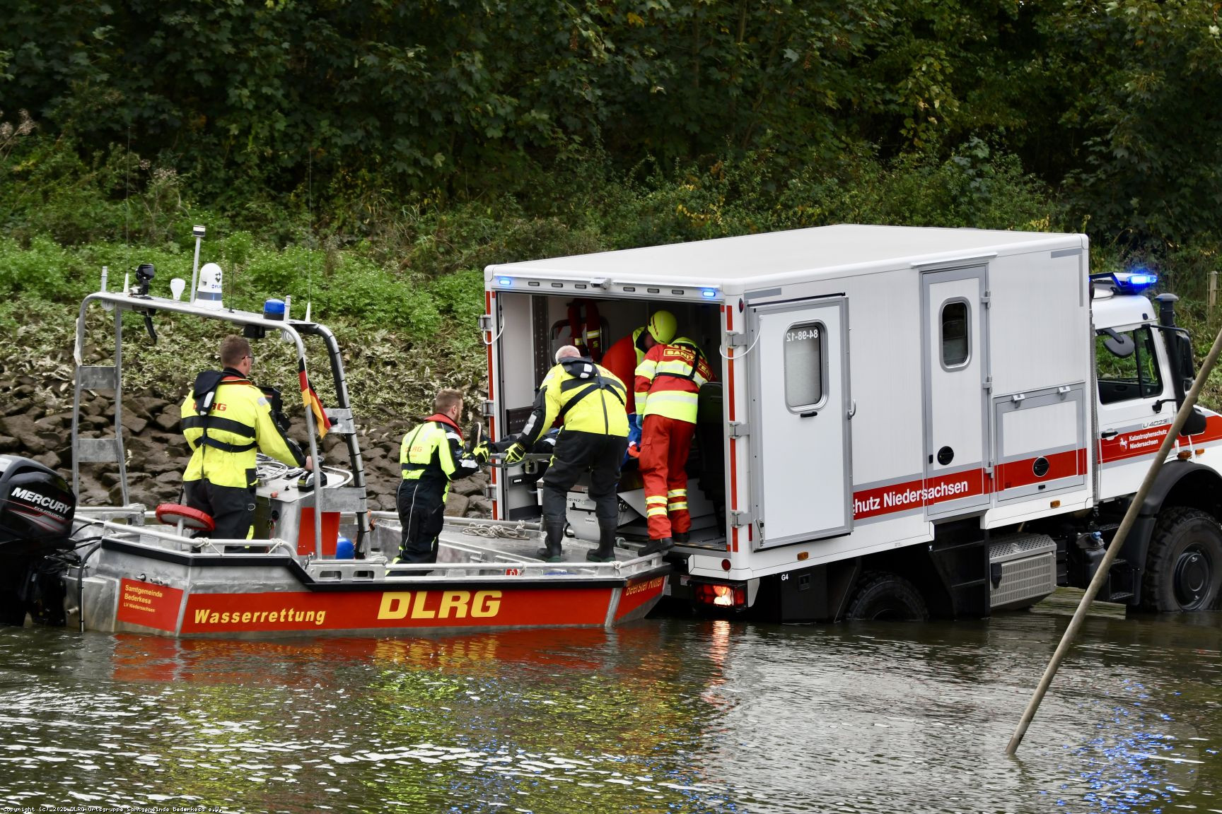 Besonders eindrucksvoll war eine Übungsaufgabe, bei der unser Boot einen Patienten direkt an den neuen Katastrophenschutz-Krankentransportwagen (KTW) auf Unimog-Basis übergab. Um die Übergabe zu ermöglichen, fuhr der Unimog rückwärts ins Wasser, sodass wir mit dem Boot direkt an die Heckklappe heranfahren und den Patienten sicher übergeben konnten.