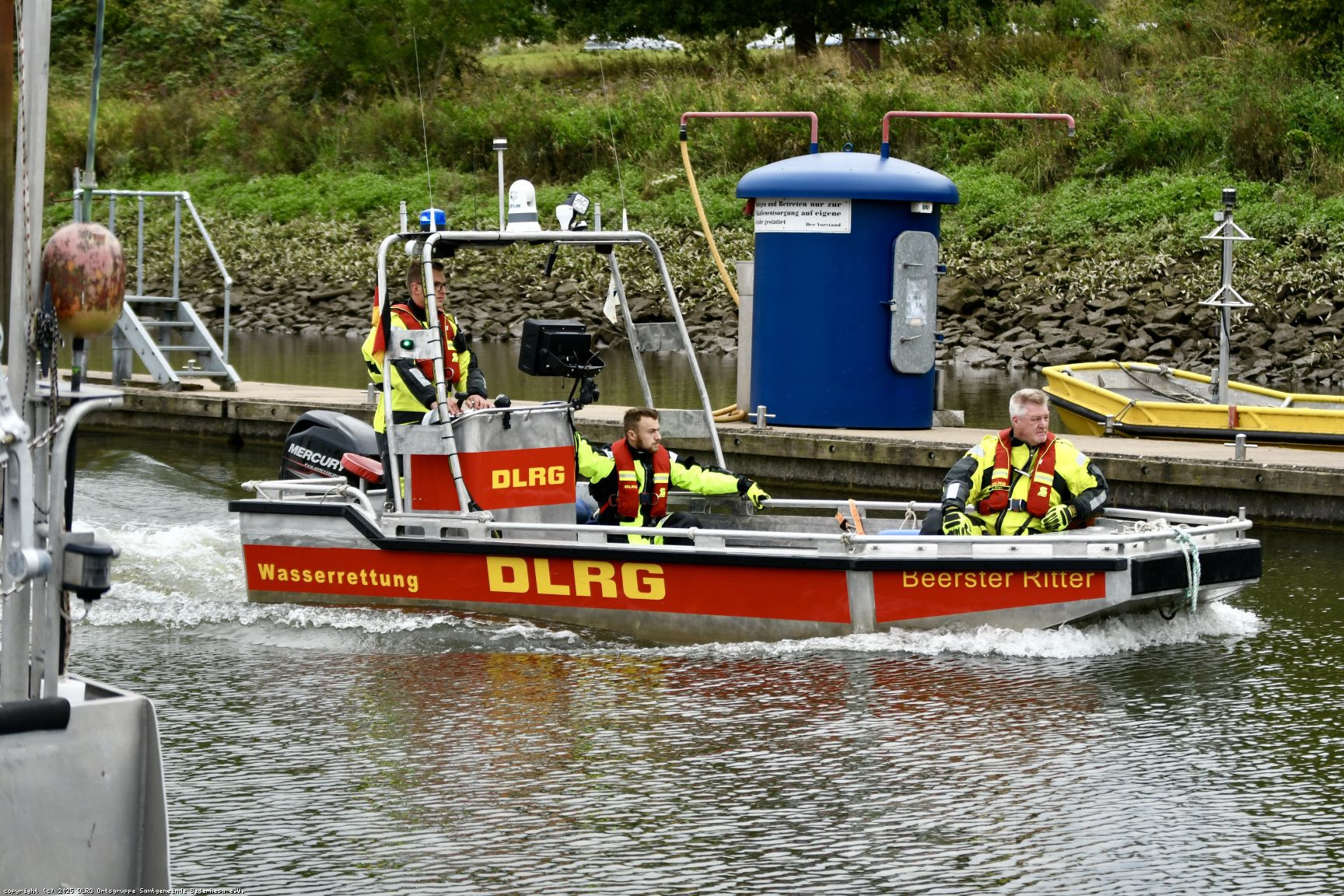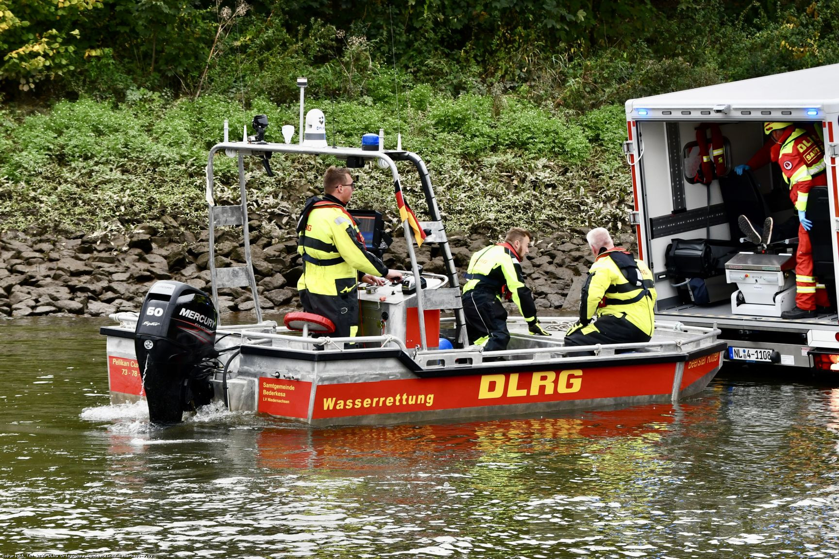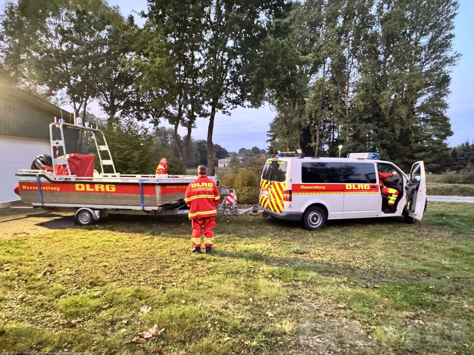 Besonders eindrucksvoll war eine Übungsaufgabe, bei der unser Boot einen Patienten direkt an den neuen Katastrophenschutz-Krankentransportwagen (KTW) auf Unimog-Basis übergab. Um die Übergabe zu ermöglichen, fuhr der Unimog rückwärts ins Wasser, sodass wir mit dem Boot direkt an die Heckklappe heranfahren und den Patienten sicher übergeben konnten.